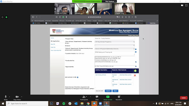 Our team had an online zoom session for our group’s risk assessment. Risk assessment is extremely important for us to ensure that we are aware of the possible hazards around us as we are carrying out our activities! Due to the current COVID situation, we could only meet online for this exercise, but we all sure did learn more on how to conduct our own personal risk assessment using the system provided by NTU! #safety